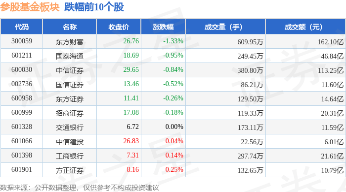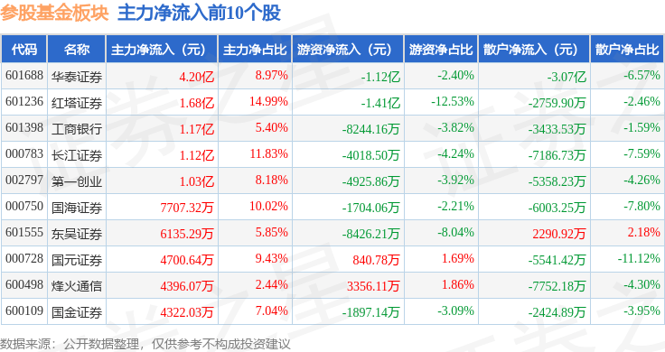 从资金流向上来看,当日参股基金板块主力资金净流出40.26亿元,游资资金净流入19.82亿元,散户资金净流入20.44亿元。参股基金板块个股资金流向见下表: