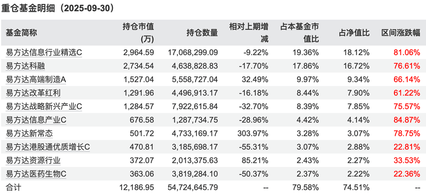 胡云峰管理的易方达优势回报基金是一只典型的内部FOF,重仓基金全数为易方达公司的基金。该基金2025年的投资主线最大的特点是,从均衡配置向科技成长倾斜,并在下半年呈现出相当的持仓集中度。