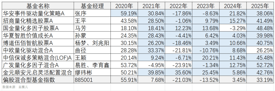 我做了一张收益率表格,稍微对比一下,金元顺安基金缪玮彬就不说了,神一般的业绩,你买不到的男人。华安基金张序在头部公募主动量化经理里,是唯一一位自2020年管理起年年跑赢偏股混合型基金指数的。招商基金王平的优势是熊市的回撤管理得好,基本上录得正收益或者一点点负收益,做到了“积跬步以至千里”,2020年至2025年过去六年累计收益率226.84%,也是名列前茅。