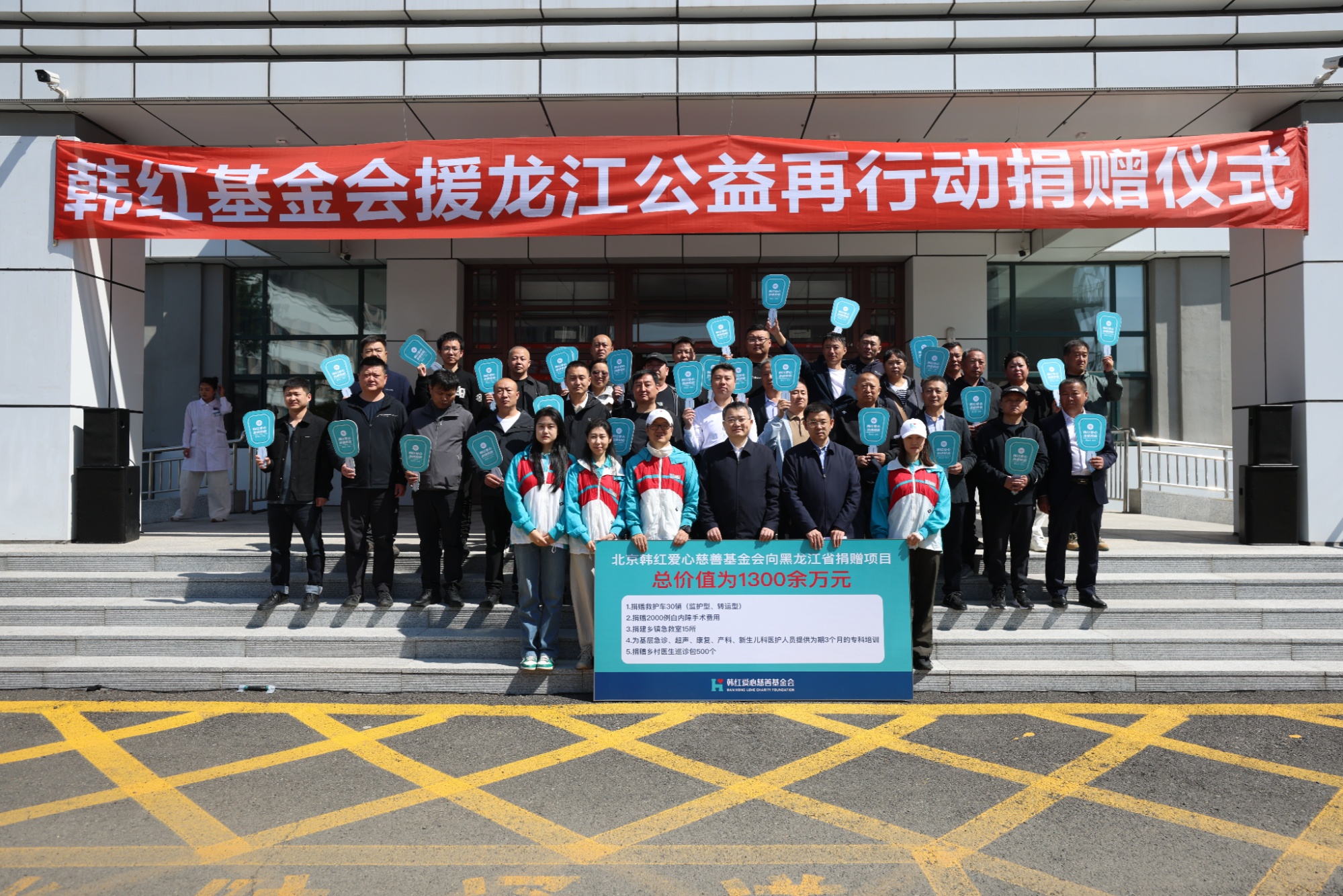 此次公益行动是韩红基金会继2023年 “韩红爱心·百人援龙江”大型医疗援助公益行动、2024年 “韩红爱心·援龙江公益再行动”后第三次对黑龙江进行医疗援助,此次为黑龙江省捐赠30辆救护车、捐建15所“韩红爱心·乡镇急救室”,为基层医护人员提供为期三个月的培训(含超声科、康复科、产科及新生儿科),支持2000例白内障复明手术费用,并为乡村医生捐赠500个巡诊包,捐赠总额1300余万元。