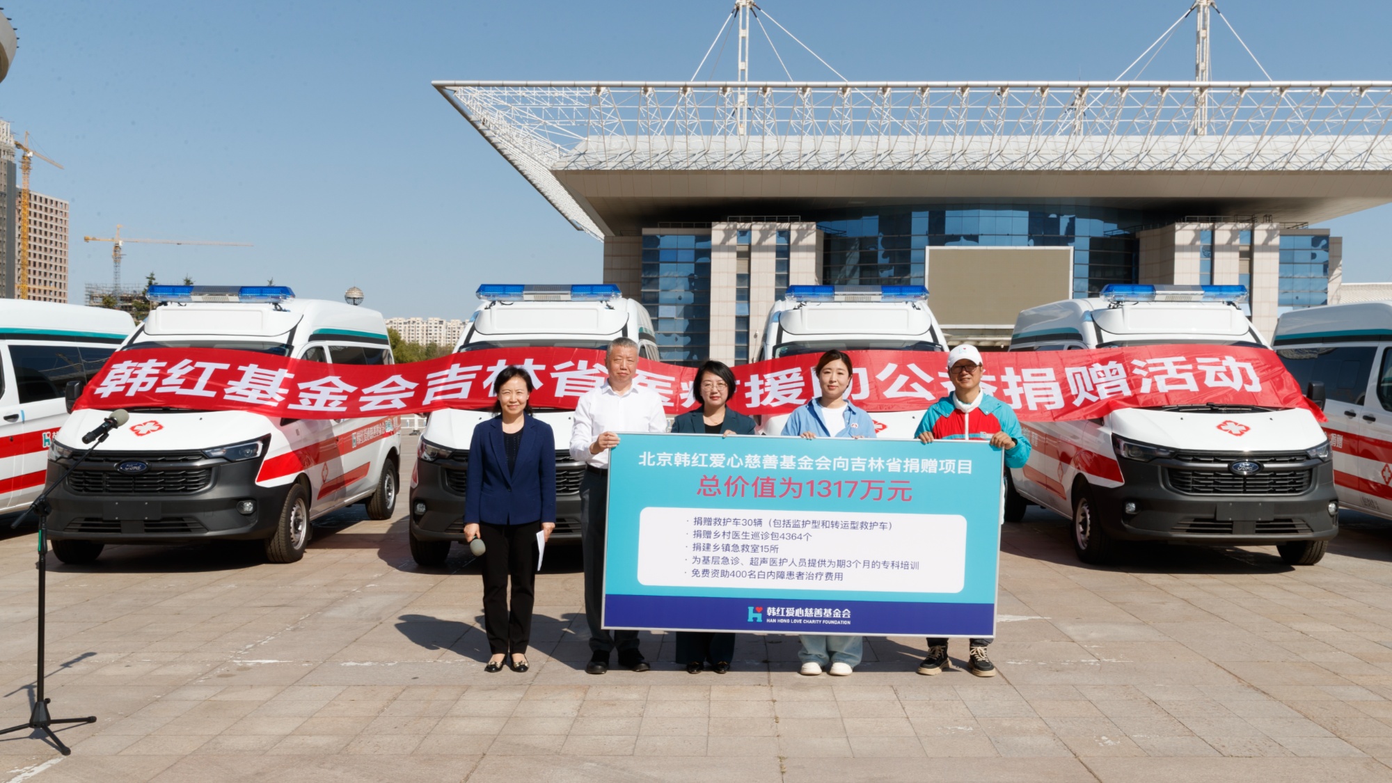 此次公益行动是韩红基金会继2024年“韩红爱心·百人援吉”大型医疗援助公益行动后,第二次对吉林进行医疗援助。此次援助行动中,韩红基金会将为吉林省捐赠救护车30辆(包括监护型和转运型救护车),捐赠乡村医生巡诊包4364个,捐建乡镇急救室15所,并为基层急诊、超声医护人员提供为期3个月的专科培训,支持400例白内障手术费用,项目捐赠总价值为1317万元。至此,基金会为吉林省累计捐赠已超4000万元,持续为基层医疗注入“生命力量”。
