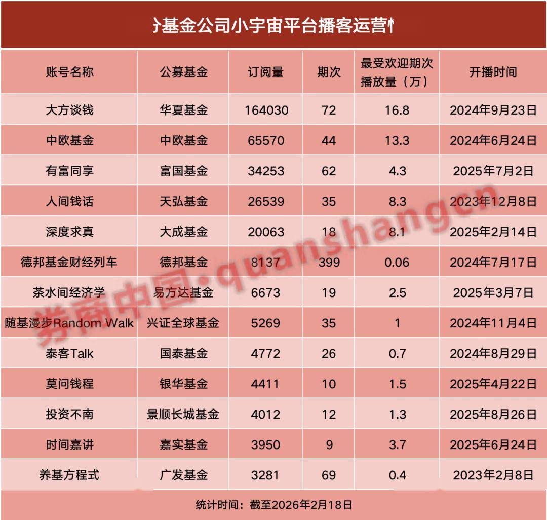 2026-02-20凤凰体育,凤凰体育直播,凤凰体育APP2025年以来,多家基金公司相继布局播客——富国基金、大成基金、银华基金、景顺长城基金、嘉实基金、汇添富基金、财通基金等公募密集推出播客栏目;与此同时,更早入局的华夏基金、中欧基金、天弘基金等机构则保持着常态化更新,华夏基金《大方谈钱》在春节期间仍推出特别节目。从新玩家的密集入场,到老玩家的稳定运营,播客正在从基金公司的“试水之作”沉淀为投资者服务的常规配置。