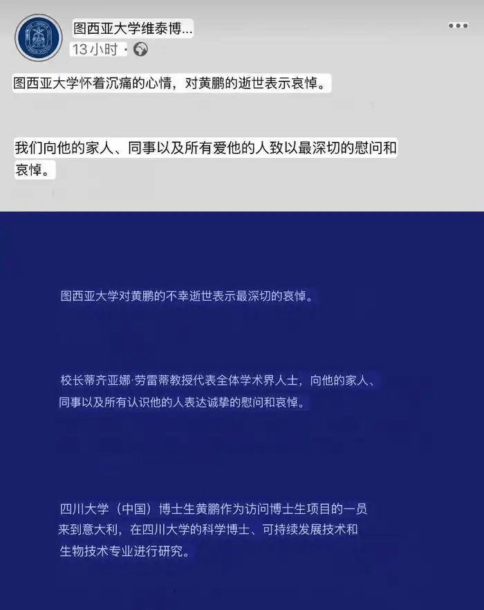 据悉,黄某生于1997年,来自贵州兴义农村,2022年进入四川大学水利水电学院攻读博士学位,2025年8月,他获得国家留学基金委奖学金,被公派至意大利图西亚大学进行为期15个月的学术交流,在1月19日早上6点30分左右,他从居住的维泰博市出发,前往多洛米蒂山区。