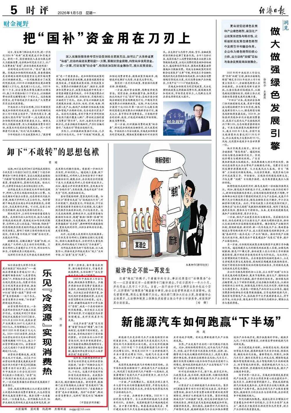 经济日报推出《乐见“冷资源”实现消费热》,其中报道吉林等地面向中小学生推行“雪假”,释放了服务消费潜力,推动了冰雪消费扩容提质;同时报道长白山和平滑雪场通过四季运营让这片山地资源实现“冬夏皆热”。
