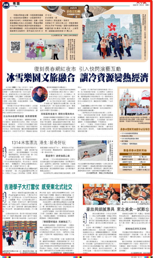 香港大公报整版推出《2025年范长江行动香港传媒学子吉林行之4|冰雪乐园文旅融合 让冷资源变热经济》《刺激十足/1314米雪漂流 港生:新奇好玩》《长春冰雪新天地部分必玩项》《采访手记/吉港学子大打雪仗 感受东北式社交》《大饱口福/豪放与细腻兼具 东北美食一试难忘》,报道从最初的冰雪观光、冰雪游玩项目,到如今的NPC(非玩家角色)互动、在地美食体验以及加入文化赋能,长春冰雪新天地近年不断进行产品升级和资源整合,提升顾客体验感。