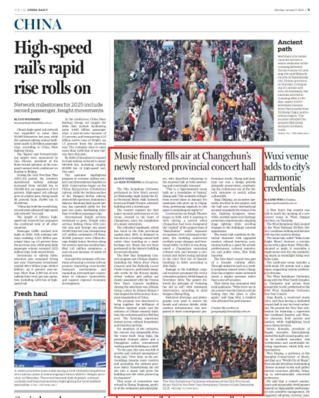 中国日报推出《跨年夜,一场融合中西经典的交响音乐会在吉林省音乐厅奏响(Music finally fills air at Changchuns newly restored provincial concert hall)》、中国日报网推出《在百年老建筑中迎接新一年》,报道吉林省音乐厅用一场融合中西经典的新年音乐会,迎来了新的一年,曾是剧场、电影院的吉林省音乐厅以全新身份,开启城市文化生活的新篇章。