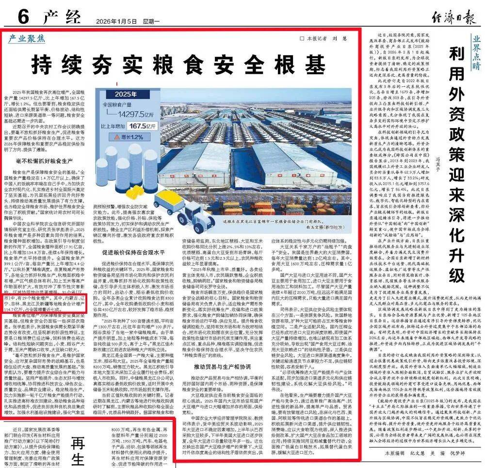 经济日报推出《持续夯实粮食安全根基》,其中报道吉林等五地粮食合计增产114.7亿斤,占全国增量近七成。