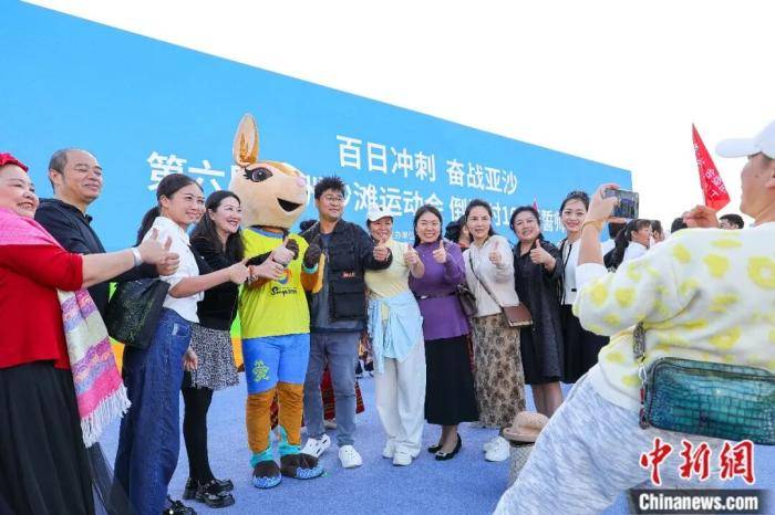 2026年1月12日,第六届亚洲沙滩运动会倒计时100天誓师大会在海南省三亚市举行,民众与三亚亚沙会吉祥物“亚亚”合影。 中新社记者 骆云飞 摄